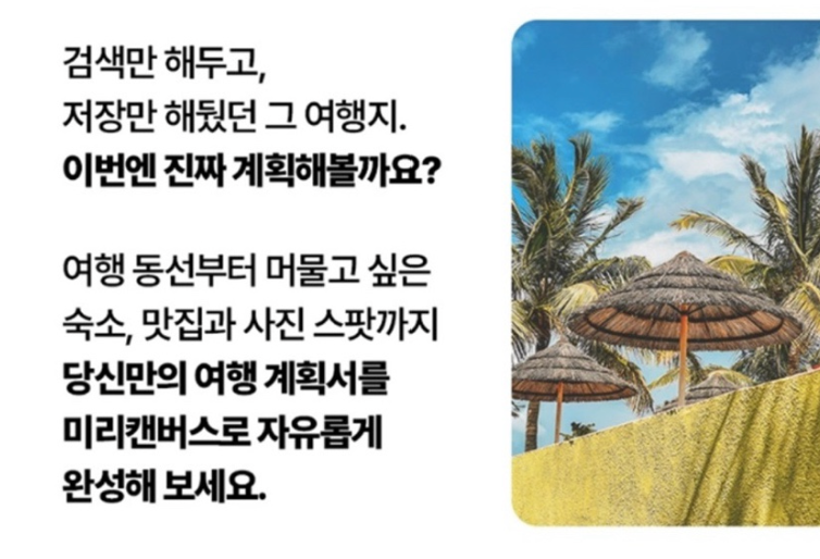 지금 미리캔버스에 접속해 여행 계획서를 작성해보세요. 누군가에게는 단순한 공모전이지만, 여러분에겐 평생 기억에 남을 1천만원 여행이 될 수 있습니다.