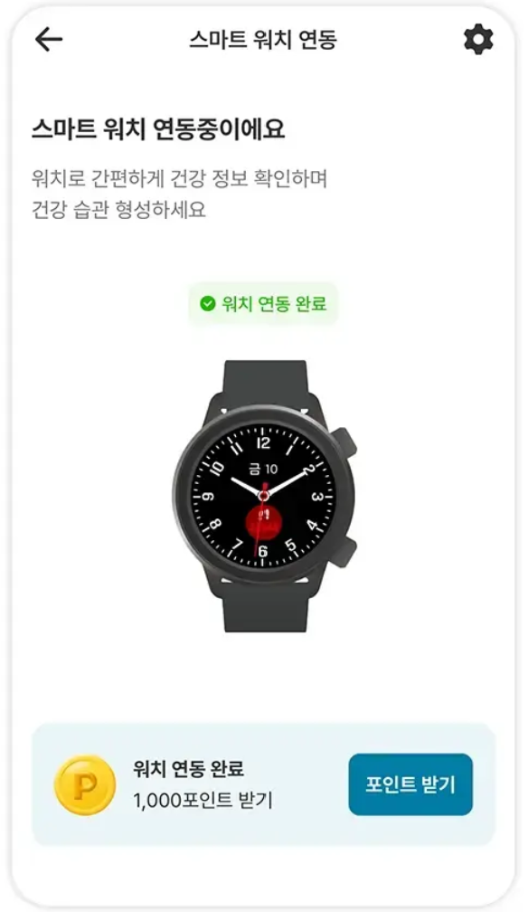 스마트워치 연동은 포인트 적립의 필수 과정입니다. 참여 승인이 완료되면 앱 내의 전체메뉴에서 기기 설정 메뉴로 이동해, 본인이 사용하는 애플워치나 갤럭시워치 혹은 스마트폰의 내장 걸음수 센서를 선택해 연동하면 됩니다. 연동이 완료되면 걸음 수, 칼로리 소모량 등의 활동 데이터가 자동으로 앱으로 전송되어 포인트가 적립됩니다.