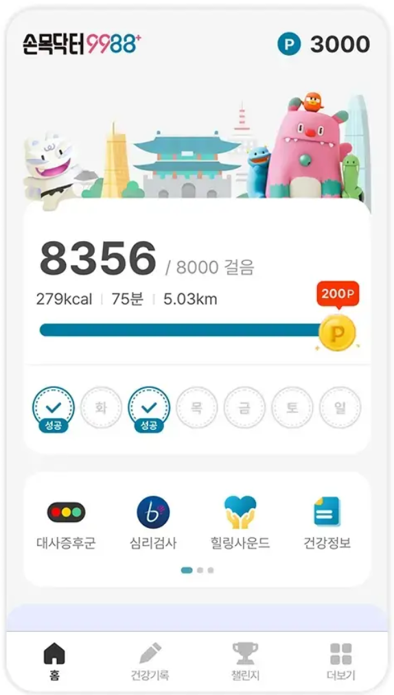 서울시는 시민의 건강습관 형성을 돕기 위해 손목닥터9988을 운영하고 있습니다. 이 프로그램은 스마트워치나 스마트폰을 통해 활동량을 측정하고 다양한 건강 미션을 수행할 때마다 포인트가 적립되도록 설계되어 있습니다. 예컨대 하루 8,000보 이상 걸으면 200포인트가 적립되며(70세 이상은 5,000보 기준), 하루 두 번의 식단 기록이나 건강목표 달성, 앱 출석 체크 등 일상적인 관리만으로도 꾸준히 포인트가 쌓입니다.