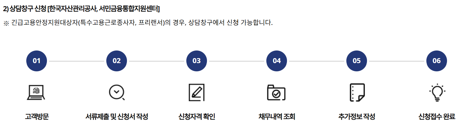 만약 서류 제출이나 전문 상담이 필요한 경우, 한국자산관리공사 또는 서민금융통합지원센터를 방문하면 현장에서 신청할 수 있습니다. 특히 긴급고용안정지원대상자(특고·프리랜서) 등은 방문 신청이 적합합니다.