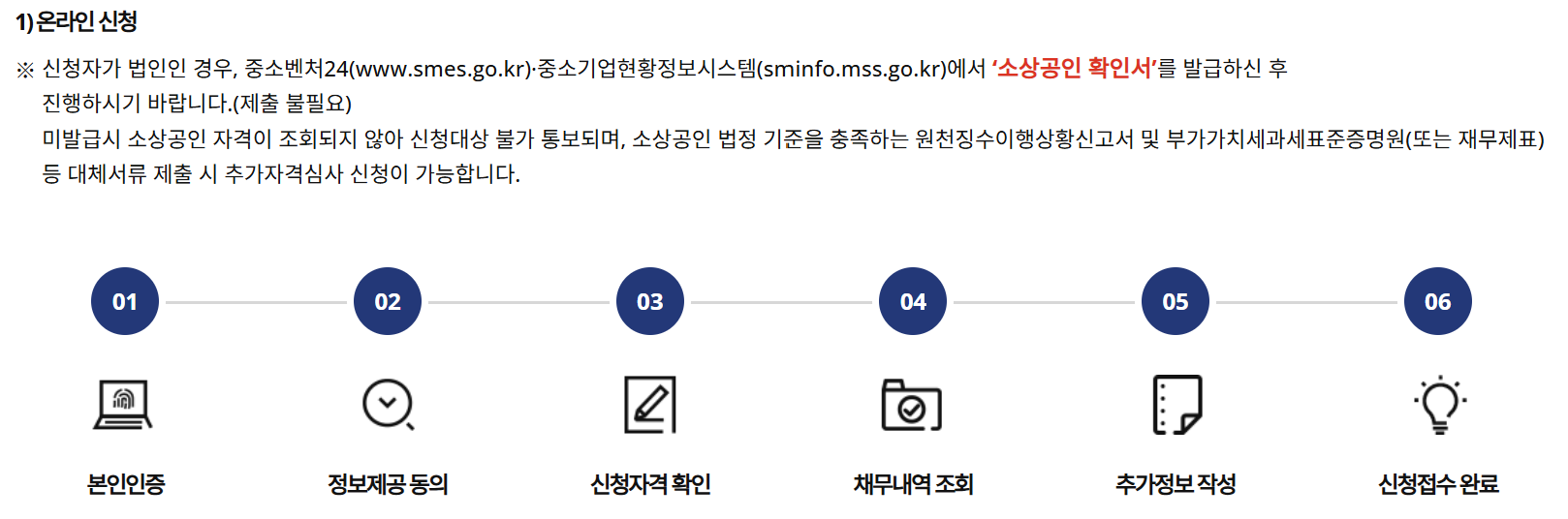 법인 신청자의 경우, 중소기업현황정보시스템 또는 중소벤처24에서 소상공인 확인서를 사전에 발급받아야 원활한 접수가 가능합니다.
