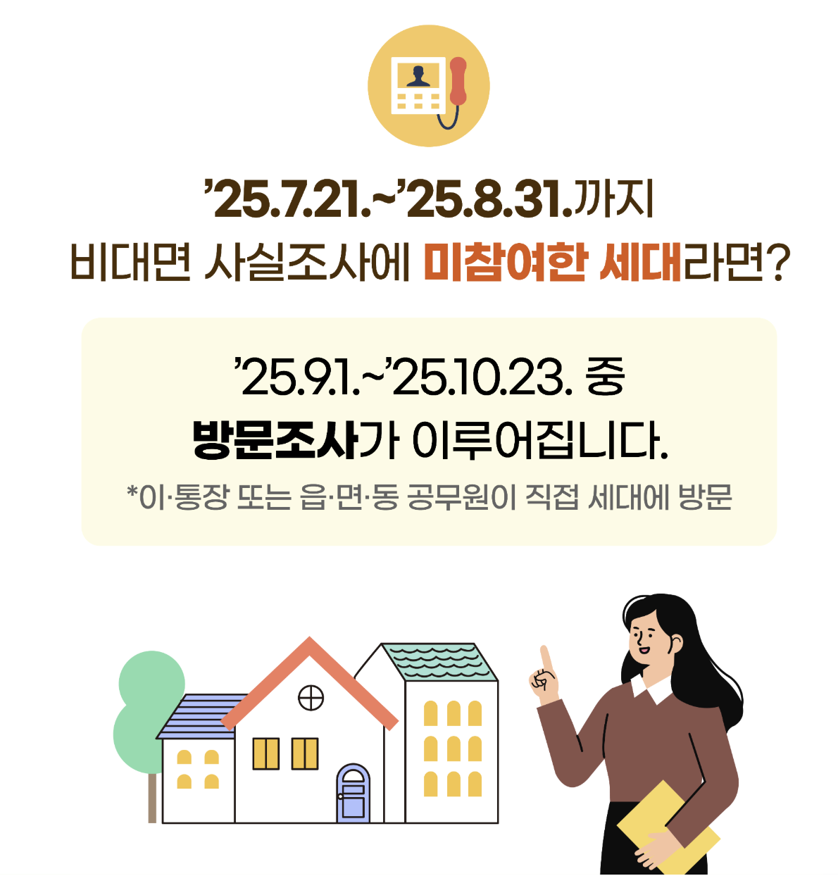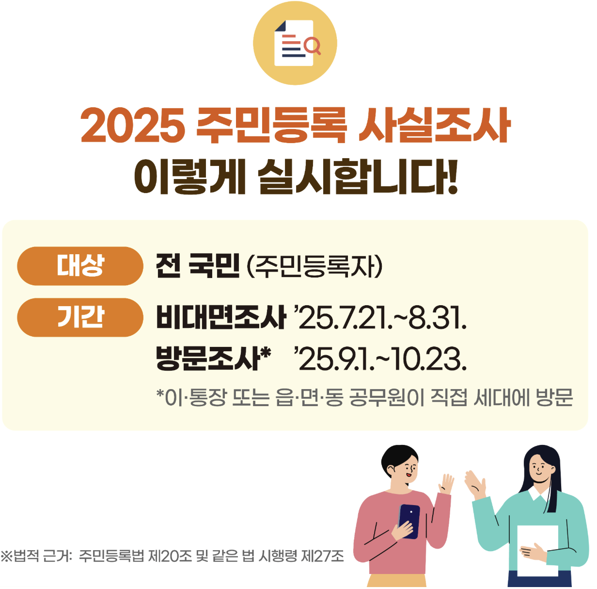 주민등록 사실조사는 전 국민을 대상으로 하는 기본조사입니다. 특히 복지 정책, 세금, 주거 정책 수립을 위한 기초자료로 활용되기에 단 한 명도 예외 없이 중요합니다.